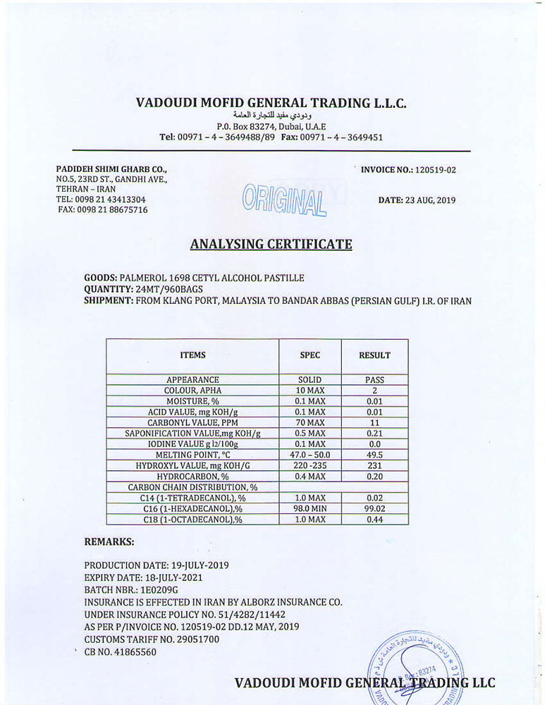 yağ alkolleri kategorisinden ve C16H34O kimyasal formüle sahip, görünümü beyaz renkli kristaller gibi olan kimyasal bir madde ve diğer çoğu yağlı alkol gibi doğada kolayca parçalanabilen toksik olmayan bir maddedir.